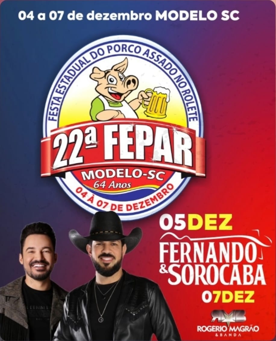 Modelo se prepara para viver dias de festa, tradição e sabores típicos com a realização da 22ª Festa Estadual do Porco Assado no Rolete (FEPAR), que acontece de 04 a 07 de dezembro no parque de eventos do município. Reconhecida em todo o Estado, a FEPAR celebra a cultura, o agronegócio e a gastronomia regional, reunindo atrações culturais, show nacional, feira comercial e programação voltada para toda a família.