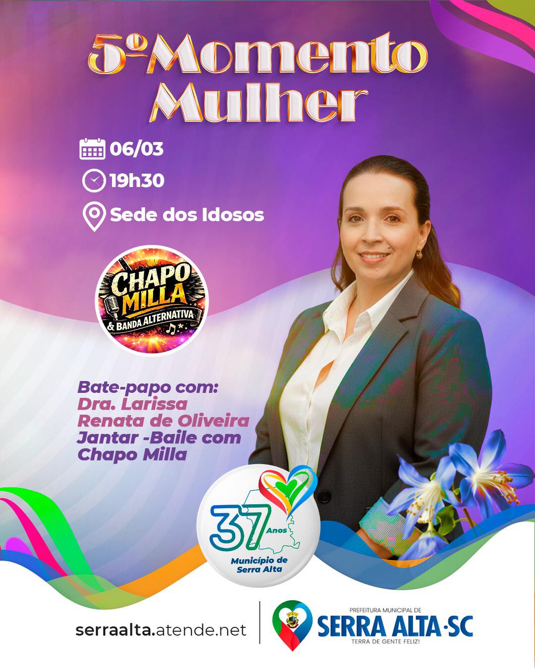 Dentro da programação comemorativa pelos 37 anos de emancipação político-administrativa de Serra Alta, o município promove na sexta-feira, dia 06 de março o 5º Momento Mulher, um evento pensado especialmente para valorizar, acolher e celebrar a força feminina na comunidade. A programação inicia às 19h30, na Sede dos Idosos, reunindo mulheres de todas as idades para uma noite de integração, conhecimento e alegria.