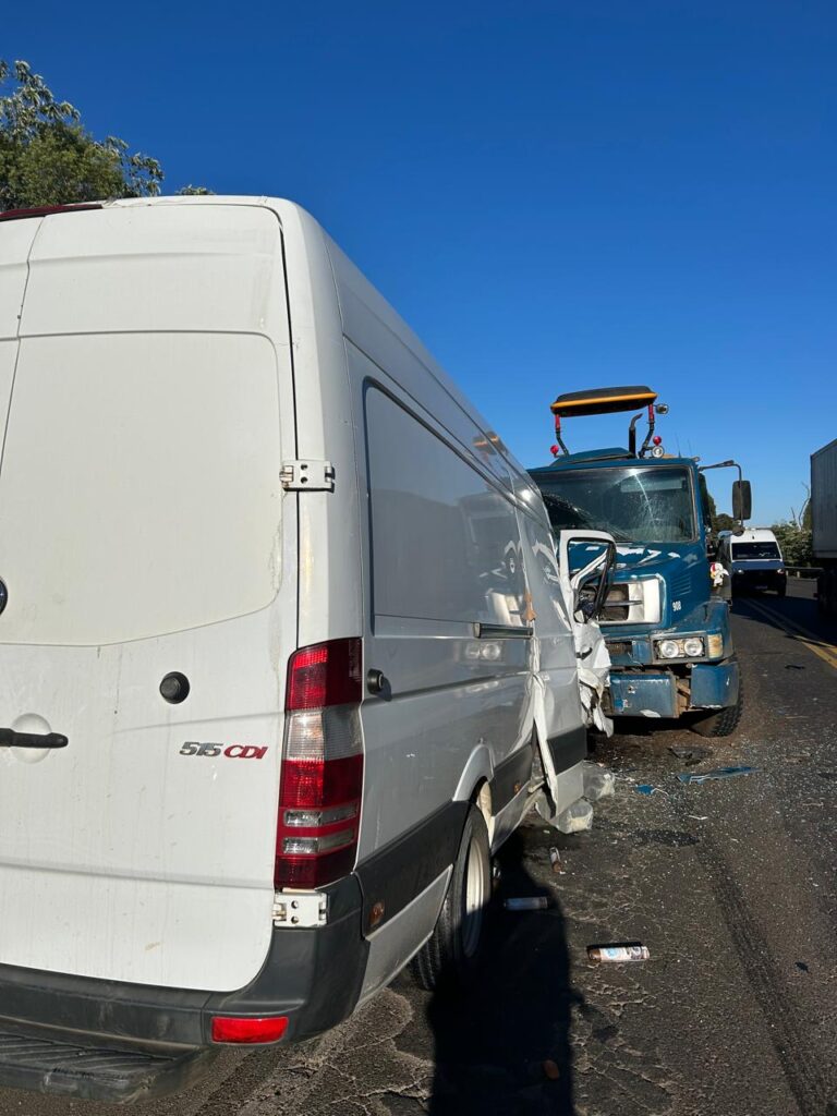 A colisão envolveu três veículos: um caminhão Mercedes-Benz 1620, uma van Mercedes-Benz Sprinter e um Chevrolet Onix.