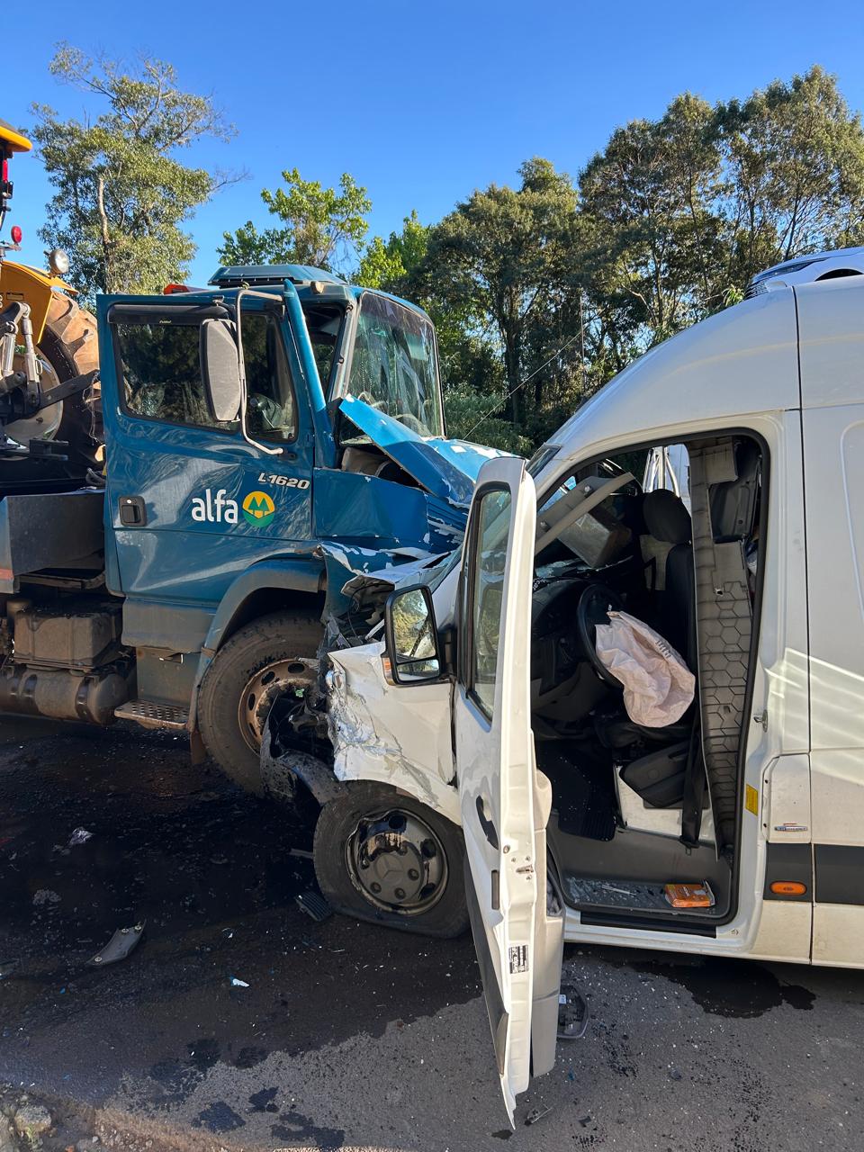 A colisão envolveu três veículos: um caminhão Mercedes-Benz 1620, uma van Mercedes-Benz Sprinter e um Chevrolet Onix.
