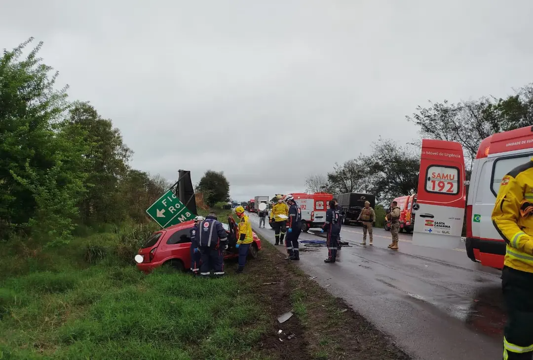 Na manhã desta sexta-feira (5), um grave acidente tirou a vida de duas pessoas na BR-282, no trevo de acesso ao município de Flor do Sertão. A colisão envolveu um GM Celta, com placas de Flor do Sertão, e uma carreta Volvo FH, de Cáceres (MT). O impacto foi tão forte que o carro foi arremessado para fora da pista.