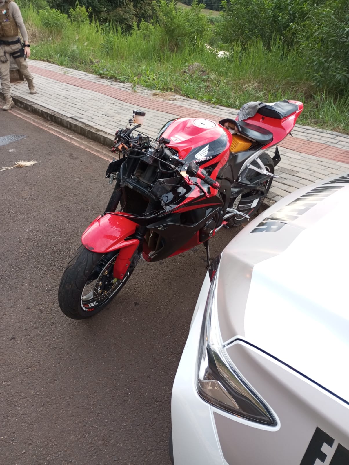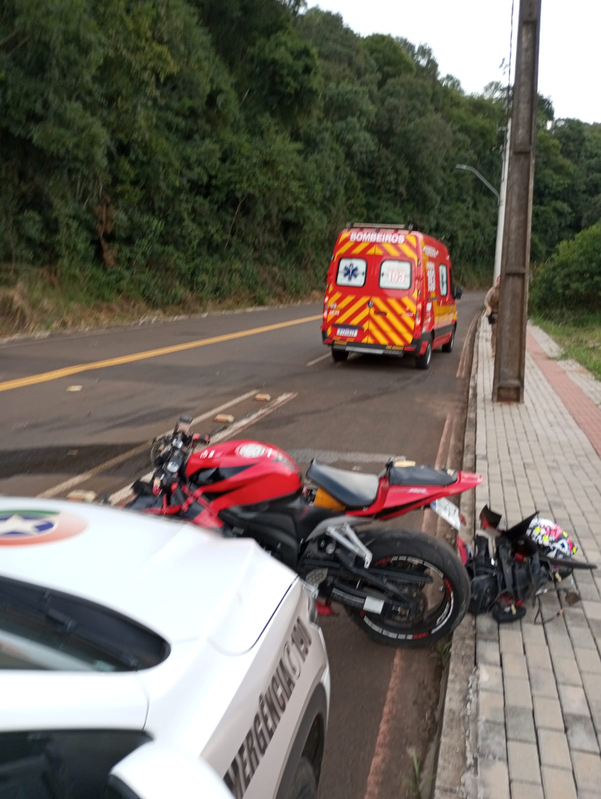 A condutora, uma mulher adulta, estava consciente e orientada, sentada às margens da via e já sem capacete. Ela relatou dores nos membros superiores e nas costas, apresentando escoriações pelo corpo e suspeita de luxação no polegar esquerdo. Seus sinais vitais estavam estáveis no momento do atendimento.
