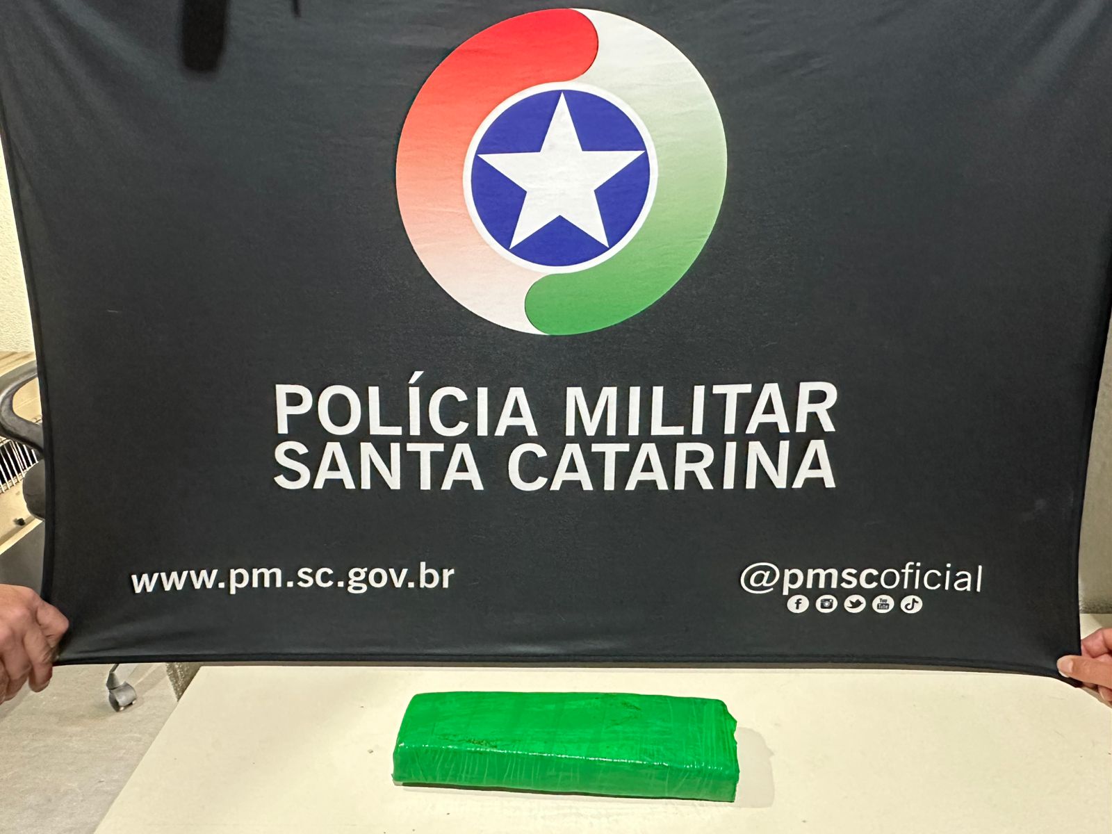 Após a varredura, os cães indicaram a presença de entorpecentes em uma área de vegetação nas proximidades. No local, os policiais localizaram um tijolo de maconha que, após pesagem, totalizou aproximadamente 770 gramas.
