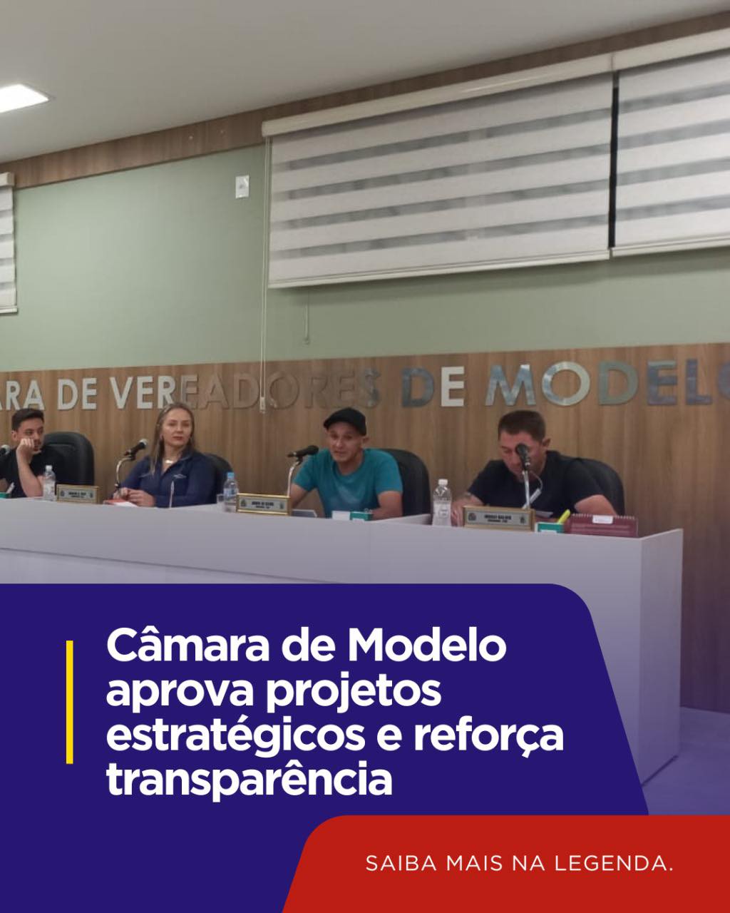 A pauta contou com a aprovação em segunda votação do Projeto de Lei Legislativo nº 03/2025, que torna obrigatória a instalação de QR Codes em placas de obras públicas, ampliando a transparência. Foram ainda apresentados e aprovados os Projetos de Lei nº 032 a 036/2025, abordando temas como alterações urbanísticas, financiamento de até R$ 6 milhões para o Programa Estrada Boa Rural, desafetação de área para construção de moradias populares, incentivo à sanidade animal e repasse de R$ 226 mil ao Hospital de Modelo, com apoio do Lions Clube e emendas parlamentares.