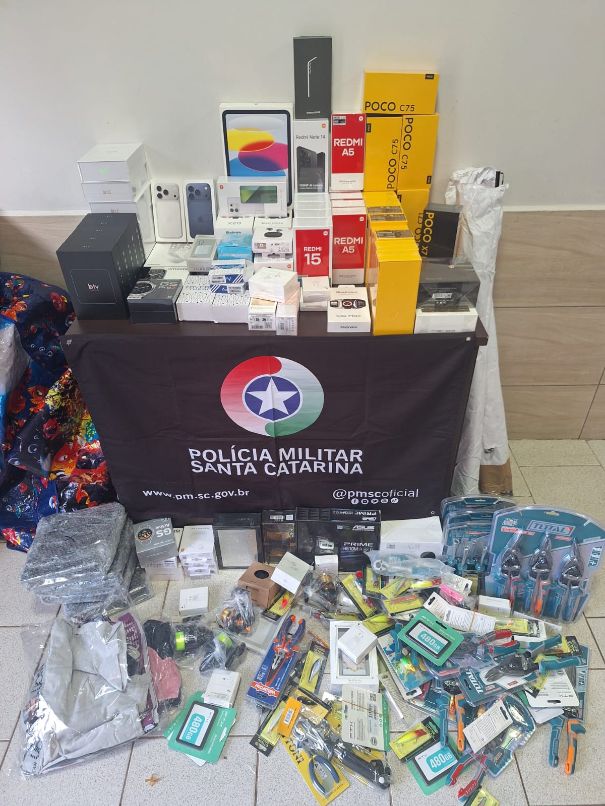 Segundo a PMRv, o carro emplacado em Águas de Chapecó era ocupado por mulheres de 41 e 60 anos. Durante a fiscalização, os policiais encontraram no porta-malas diversas sacolas contendo mercadorias trazidas do Paraguai, incluindo 31 celulares, eletrônicos, ferramentas e outros itens.