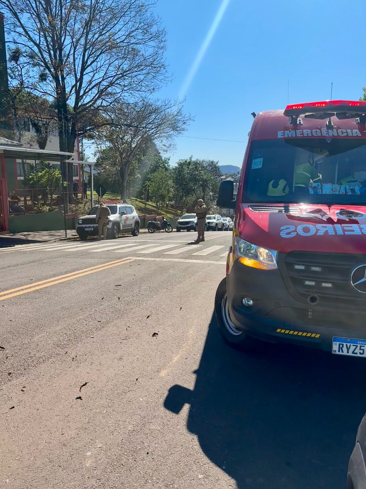 Ao chegarem ao local, os socorristas encontraram a vítima, um menino de 9 anos, consciente e orientado, sentado em uma cadeira na calçada. Segundo relatos, a criança foi atingida por um automóvel enquanto atravessava a faixa de pedestres em frente à escola Professor Patrício João de Oliveira.