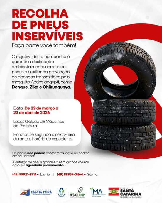 O município de Cunha Porã iniciou nesta segunda-feira (23), uma importante campanha de recolha de pneus inservíveis, com o objetivo de garantir a destinação ambientalmente correta desses materiais e reforçar o combate a doenças transmitidas pelo mosquito Aedes aegypti, como dengue, zika e chikungunya. A ação segue até o dia 23 de abril de 2026 e convida toda a população a participar.