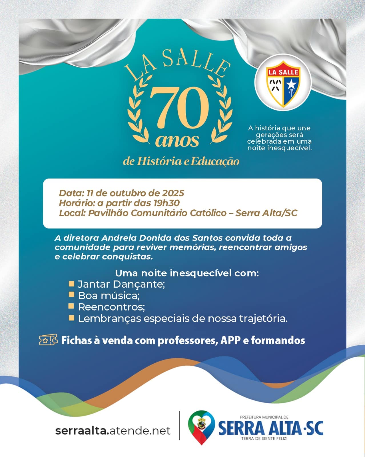O evento será realizado no dia 11 de outubro, a partir das 19h30, no Pavilhão Comunitário Católico, em Serra Alta/SC. A noite especial contará com Jantar Dançante, música ao vivo, reencontros e muitas lembranças que marcaram gerações de estudantes ao longo dessas sete décadas.