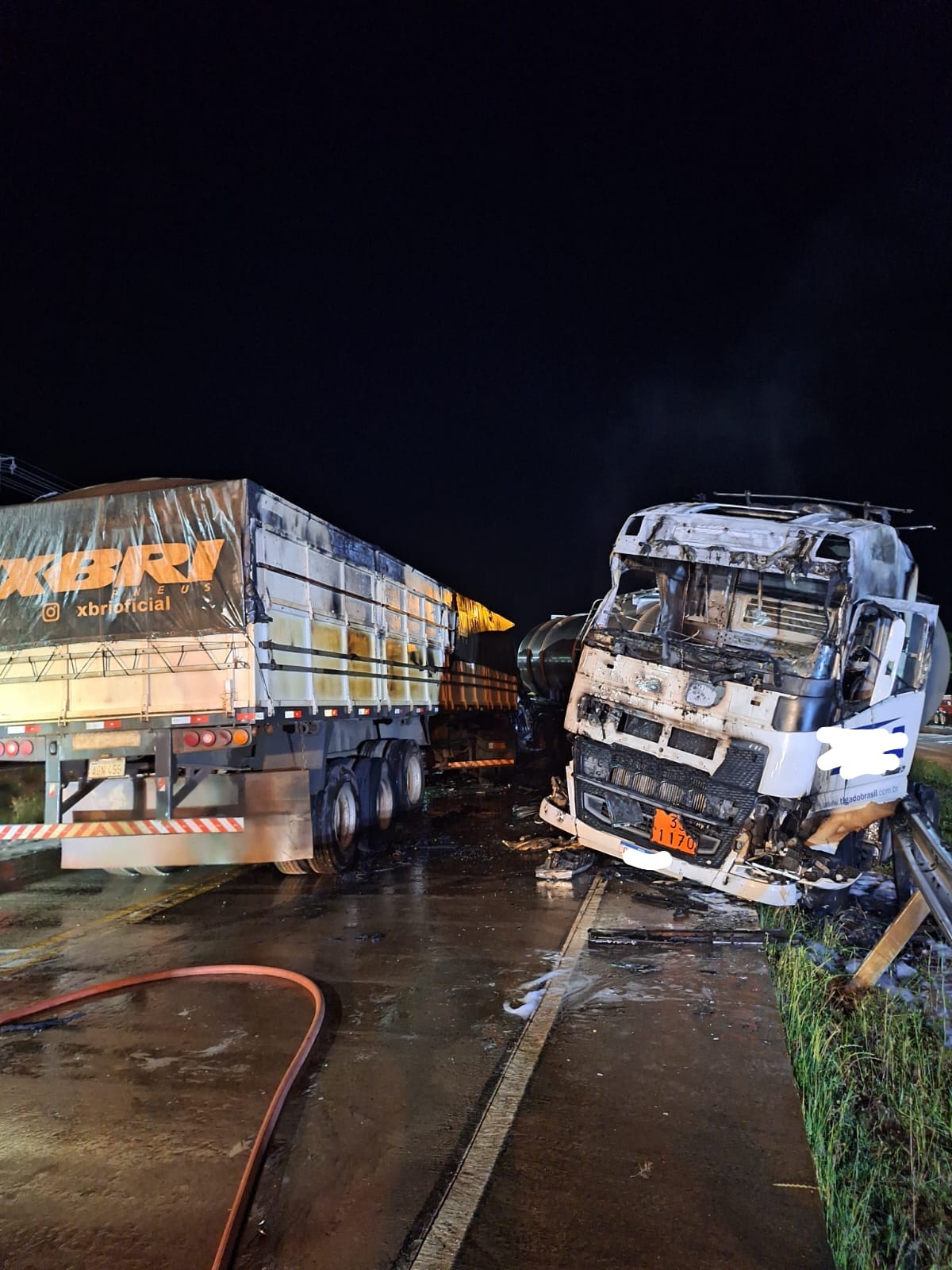 O condutor da outra carreta, que pegou fogo, informou que conseguiu sair sozinho do veículo e recusou atendimento pré-hospitalar.