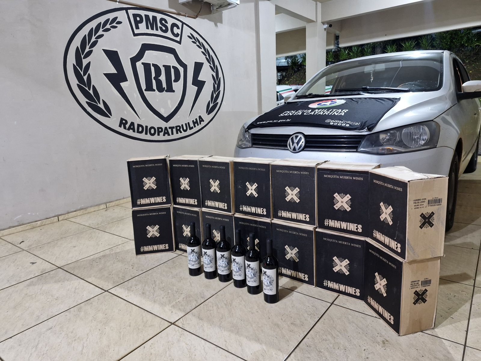 Durante patrulhamento, os policiais avistaram um veículo VW/Voyage que apresentava a traseira visivelmente rebaixada, o que levantou suspeitas. Ao abordarem o automóvel, encontraram um homem de 62 anos transportando 15 caixas de vinho — totalizando 90 garrafas — avaliadas em aproximadamente R$ 4.050,00. Além da carga de vinhos, o carro também levava alguns produtos de supermercado.