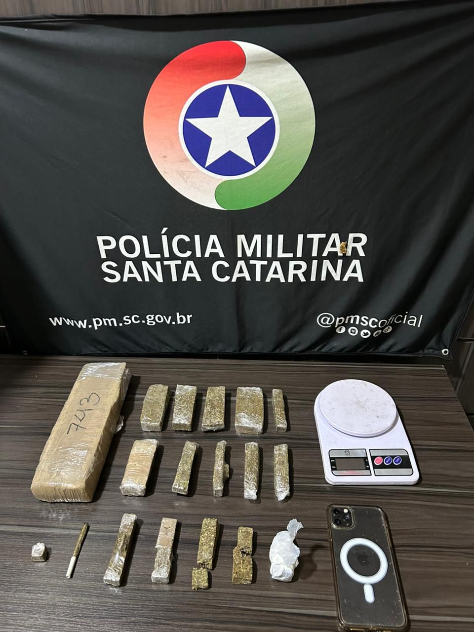 Durante a abordagem, os policiais encontraram e apreenderam aproximadamente 1,175 kg de maconha, além de uma balança de precisão, equipamento comumente utilizado para fracionar drogas para a venda.