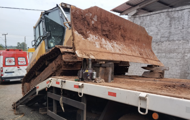 Um homem ficou ferido na manhã desta quinta-feira (2) após ser prensado pela concha de um trator de esteira em uma edificação comercial às margens da SC-283, em São Carlos.