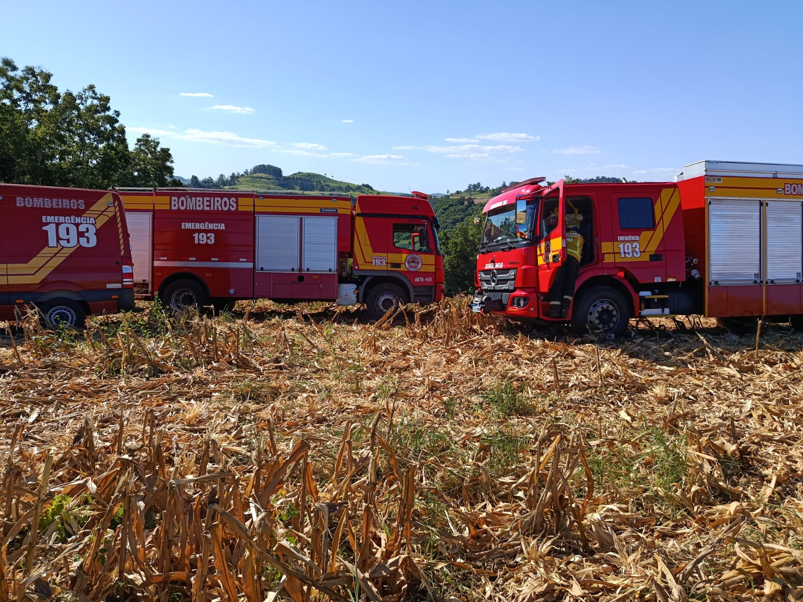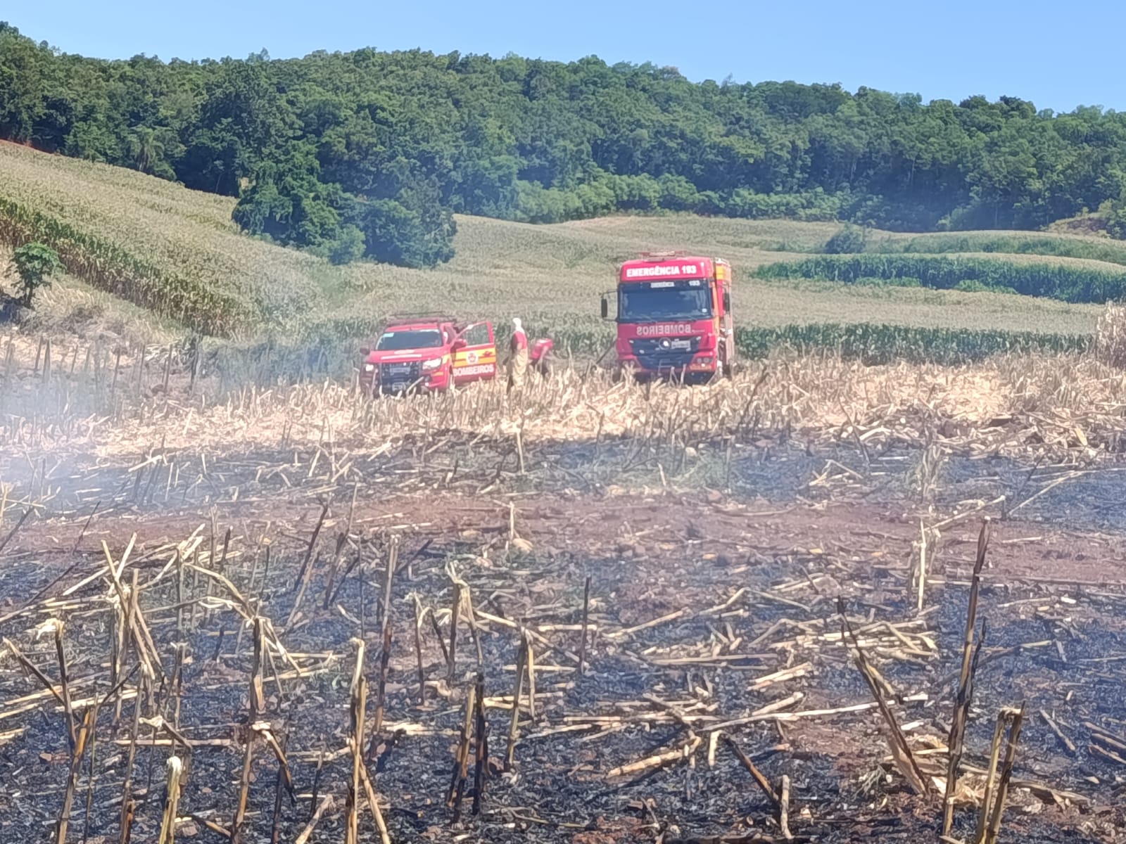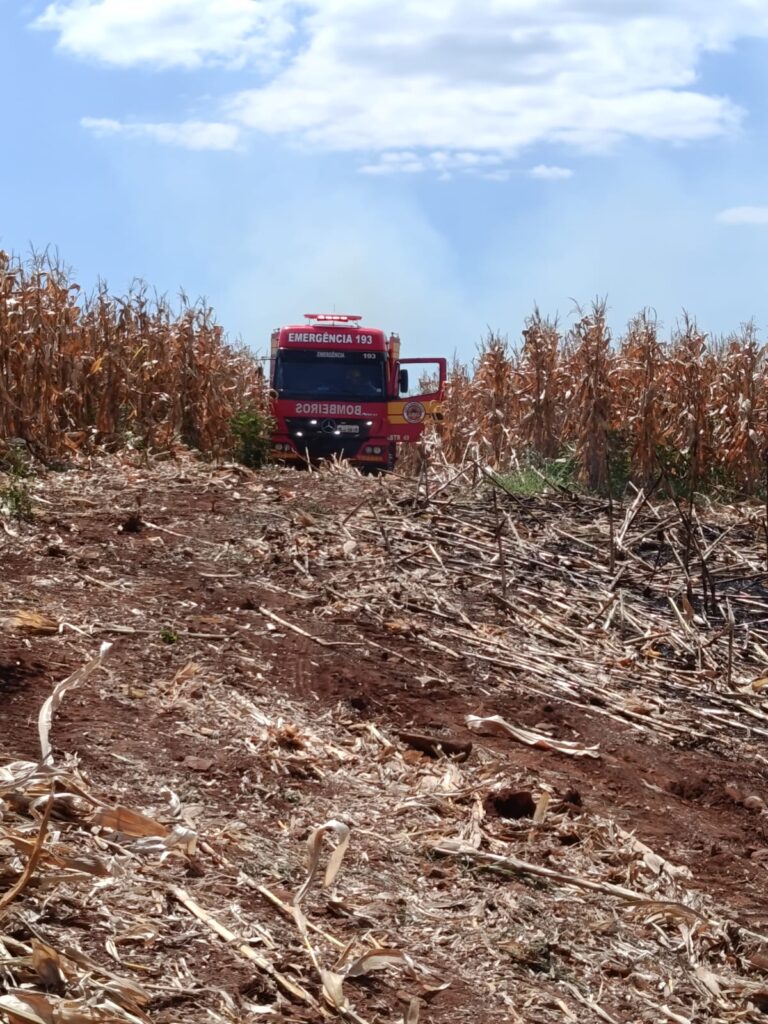 Ao chegarem ao local, os bombeiros constataram a presença de fumaça na máquina. O foco inicial do incêndio já havia sido controlado por populares, porém, devido à ação do vento, fagulhas se espalharam por diversos pontos da lavoura de milho seco, que estava pronta para colheita.