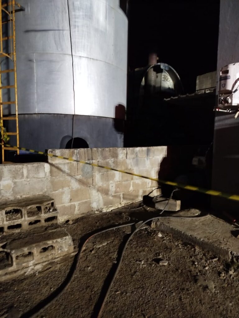 Ao chegar no local, a equipe constatou que o fogo atingia a parte externa do tanque, resultando em um vazamento do material inflamável e gerando um alto risco de explosão. A situação exigiu ações rápidas e coordenadas para evitar maiores danos.