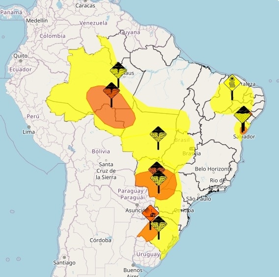 Ainda, o Inmet alerta a população das regiões afetadas para ventos intensos, com rajadas de 60 a 100 km/h e queda de granizo. Há risco de corte de energia elétrica, estragos em plantações, queda de árvores e de alagamentos.