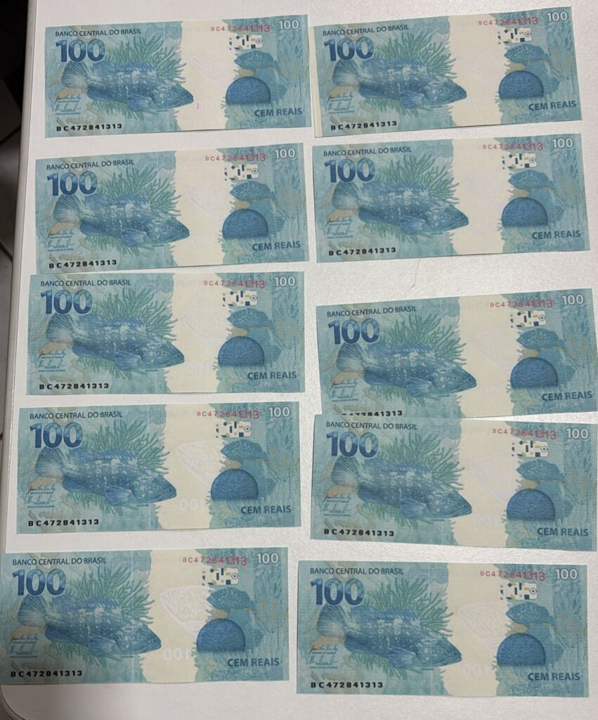 Durante a abordagem, os policiais encontraram com o suspeito dez cédulas falsas de R$ 100, totalizando R$ 1.000,00 em dinheiro falsificado. O material estava cuidadosamente escondido dentro de um livro de palavras cruzadas, o que levantou suspeitas e motivou a ação rápida das forças de segurança.