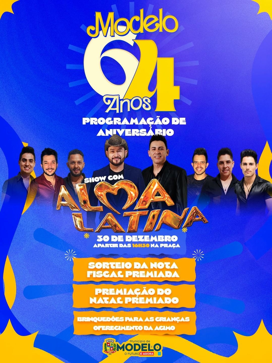 Para marcar essa data tão especial, o Governo Municipal prepara uma grande programação festiva, aberta a toda a população, que acontecerá na Praça Municipal, a partir das 16h30. A comemoração contará com show da banda Alma Latina, trazendo música e alegria para celebrar o aniversário da cidade.
