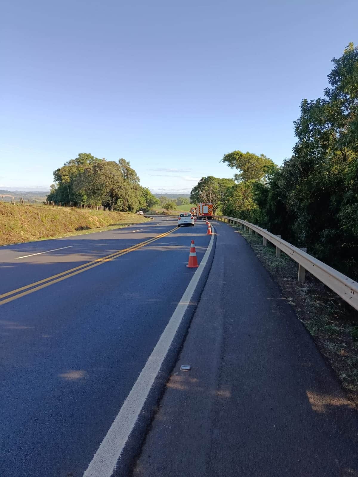 Ao chegarem ao local, os bombeiros encontraram a vítima — um homem maior de idade — consciente e orientado, em pé e apoiado no guard-rail, sendo amparado por um popular. O motociclista relatou que colidiu contra um cachorro que estava na pista e, em seguida, caiu sobre a rodovia.