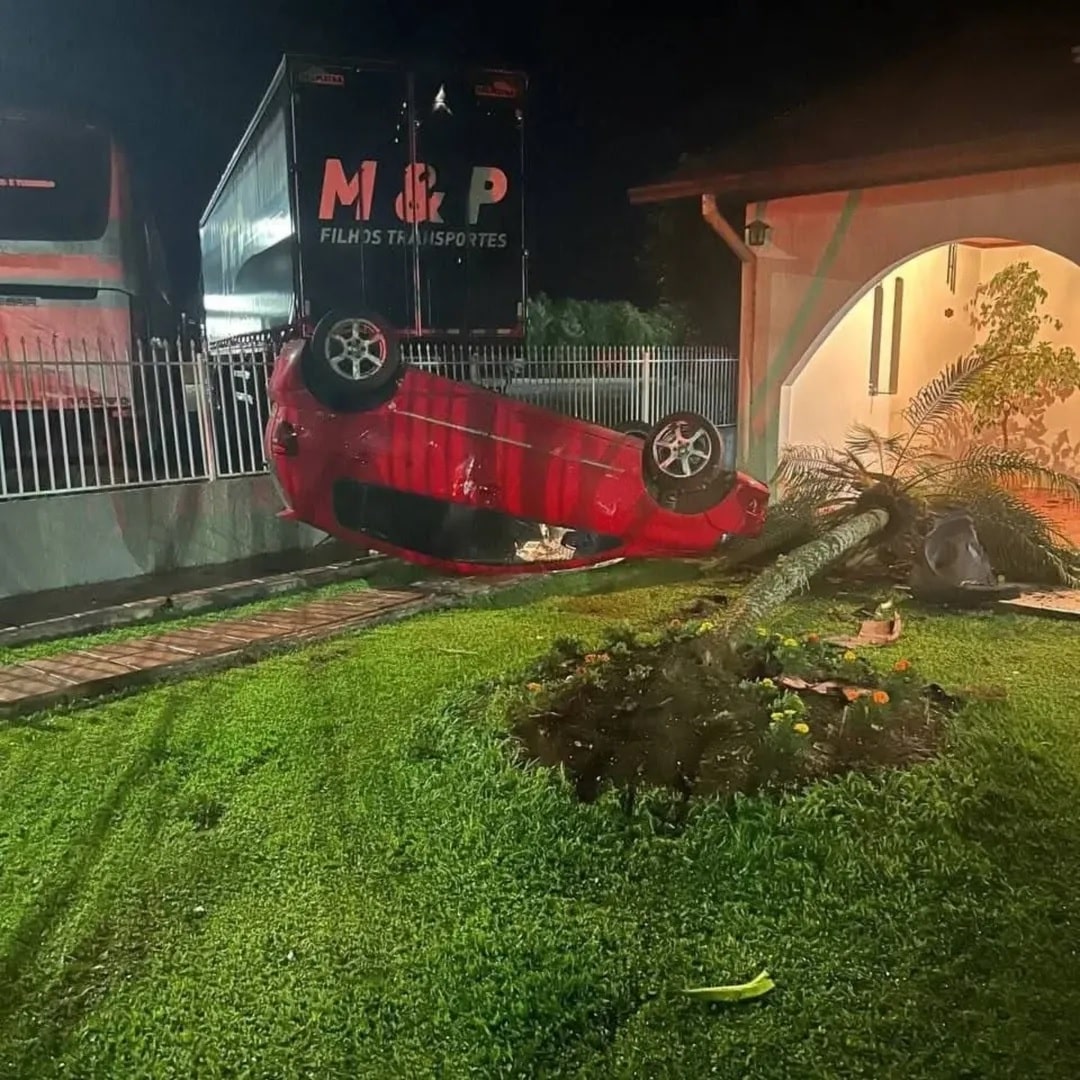 A proprietária do terreno, uma mulher de 60 anos, contou que acordou assustada com o barulho e encontrou o carro virado em meio aos danos causados na grade e em uma palmeira do local.