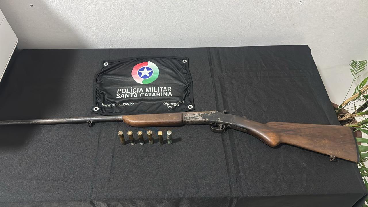 No local, os policiais abordaram um homem de 41 anos. Durante buscas no imóvel, foi encontrada uma espingarda calibre 36, acompanhada de seis munições — três delas já deflagradas. Conforme a PM, a arma não possuía registro.