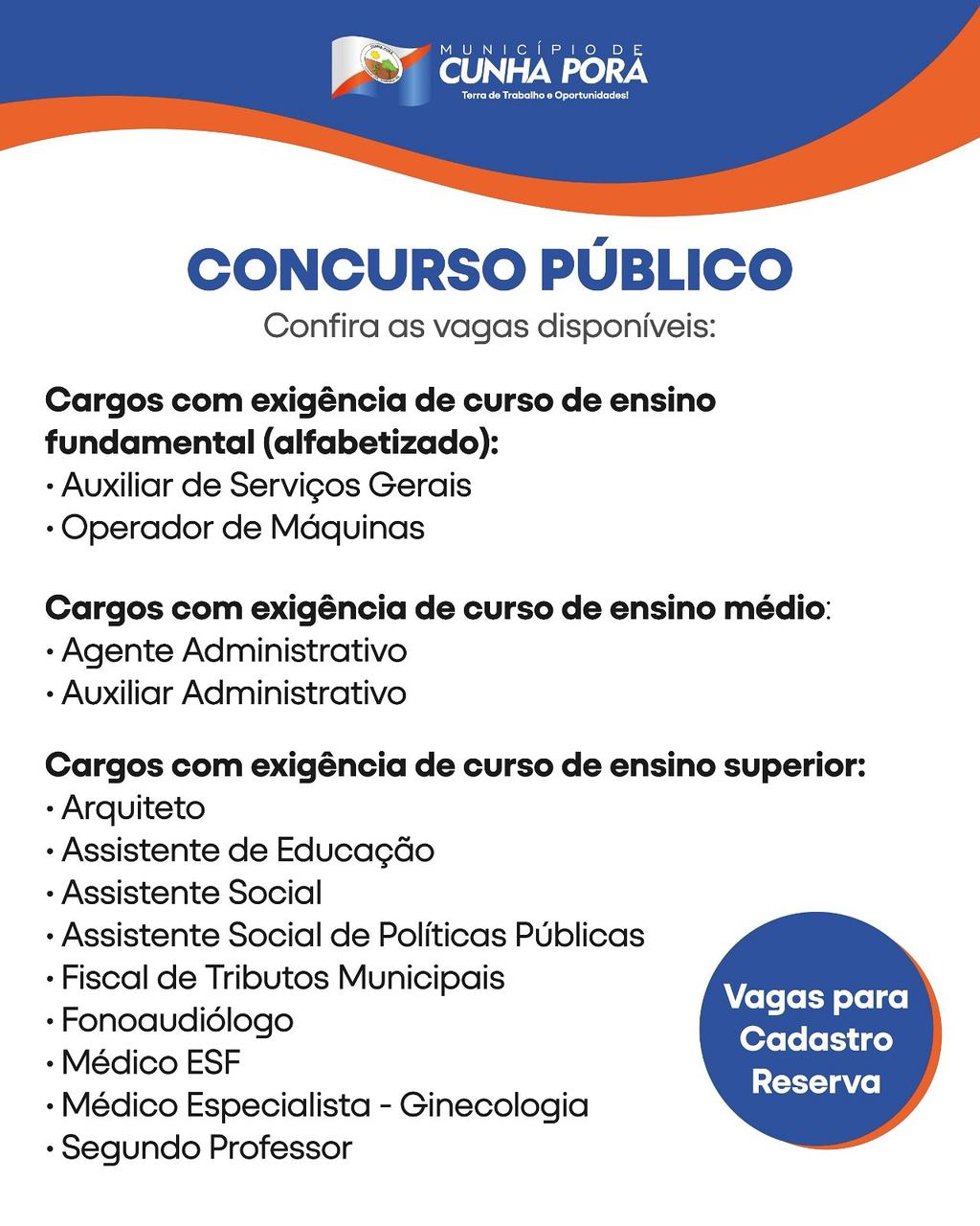 A Prefeitura de Cunha Porã anunciou a abertura de inscrições para o Concurso Público, com vagas em diferentes áreas e níveis de escolaridade. O certame contempla cargos de nível fundamental, médio e superior, abrangendo setores administrativos, serviços gerais, saúde, educação e fiscalização.
