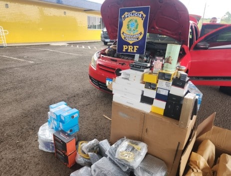Na manhã de quinta-feira (16), a Polícia Rodoviária Federal (PRF) apreendeu mais de 100 itens de mercadorias sem o devido desembaraço aduaneiro na BR-282, no município de Iraceminha, região Oeste de Santa Catarina. Os produtos, que incluíam cigarros, cosméticos e diversos eletrônicos, estavam sendo transportados em um automóvel.