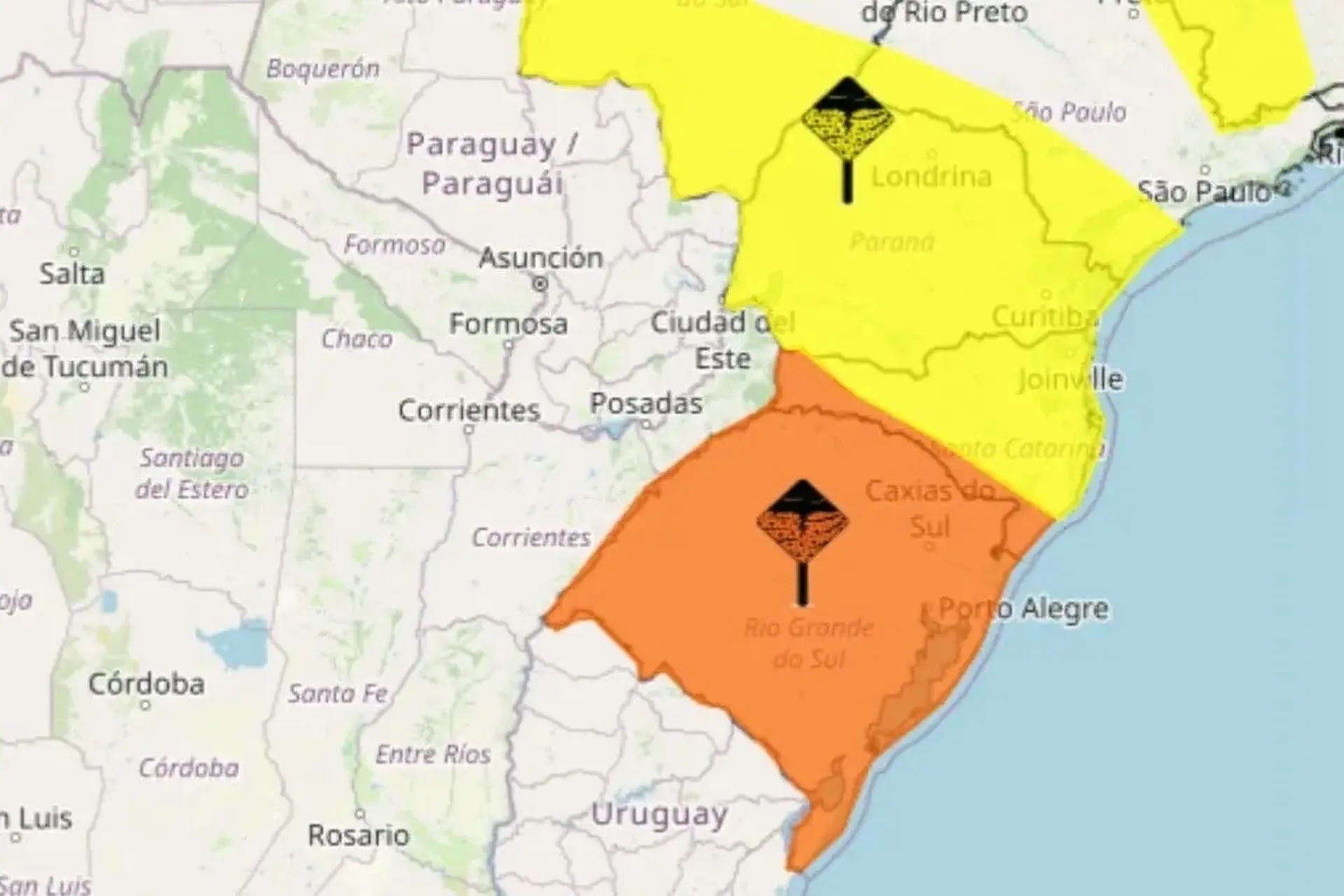 Também são esperados ventos intensos, com rajadas que podem chegar a 100 km/h e queda de granizo. Há risco de corte de energia elétrica, estragos em plantações, queda de árvores e de alagamentos.