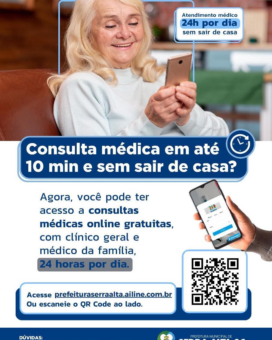 A Secretaria Municipal de Saúde de Serra Alta instituiu um novo serviço de telemedicina 24 horas, oferecendo consultas médicas online com clínico geral e médico da família. A iniciativa amplia o acesso da população aos atendimentos de saúde, garantindo mais agilidade, comodidade e segurança. Para utilizar o serviço, basta acessar o endereço eletrônico https://prefeituraserraalta.ailine.com.br