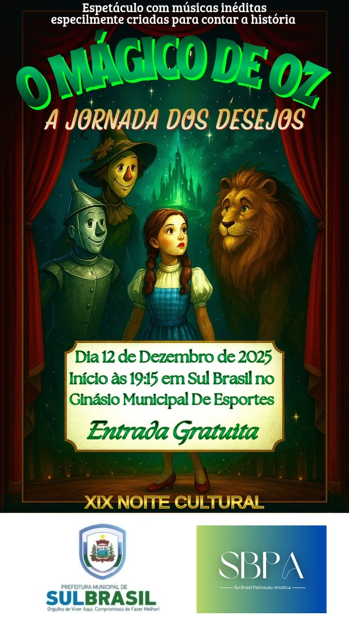 O município de Sul Brasil se prepara para uma noite de magia, encanto e muita emoção com a realização da XIX Noite Cultural, que neste ano trará ao público o espetáculo “O Mágico de Oz – A Jornada dos Desejos”, uma apresentação inédita da Sul Brasil Patinação Artística (SBPA). O evento acontece nesta sexta-feira (12) com início às 19h15, no Ginásio Municipal de Esportes, e terá entrada gratuita.