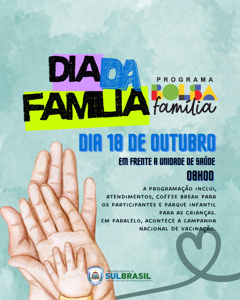 No próximo dia 18 de outubro a partir das 8h da manhã até às 12h, o município de Sul Brasil realiza o 1º Dia da Família do Programa Bolsa Família (PBF). A iniciativa será realizada em articulação intersetorial pela gestão do Programa, contando com a participação das áreas de Assistência Social, Educação e Saúde, fortalecendo o acompanhamento das condicionalidades e ampliando os impactos positivos junto às famílias beneficiárias.
