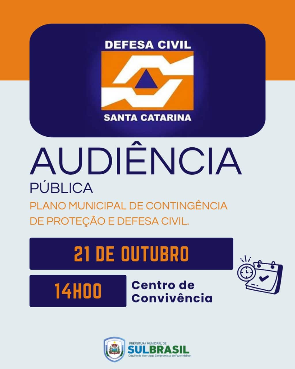 O Governo Municipal de Sul Brasil, por meio da Coordenadoria Municipal de Proteção e Defesa Civil (COMPDEC), realizará na próxima terça-feira (21), às 14h, uma audiência pública para deliberação e aprovação do Plano Municipal de Contingência de Proteção e Defesa Civil.