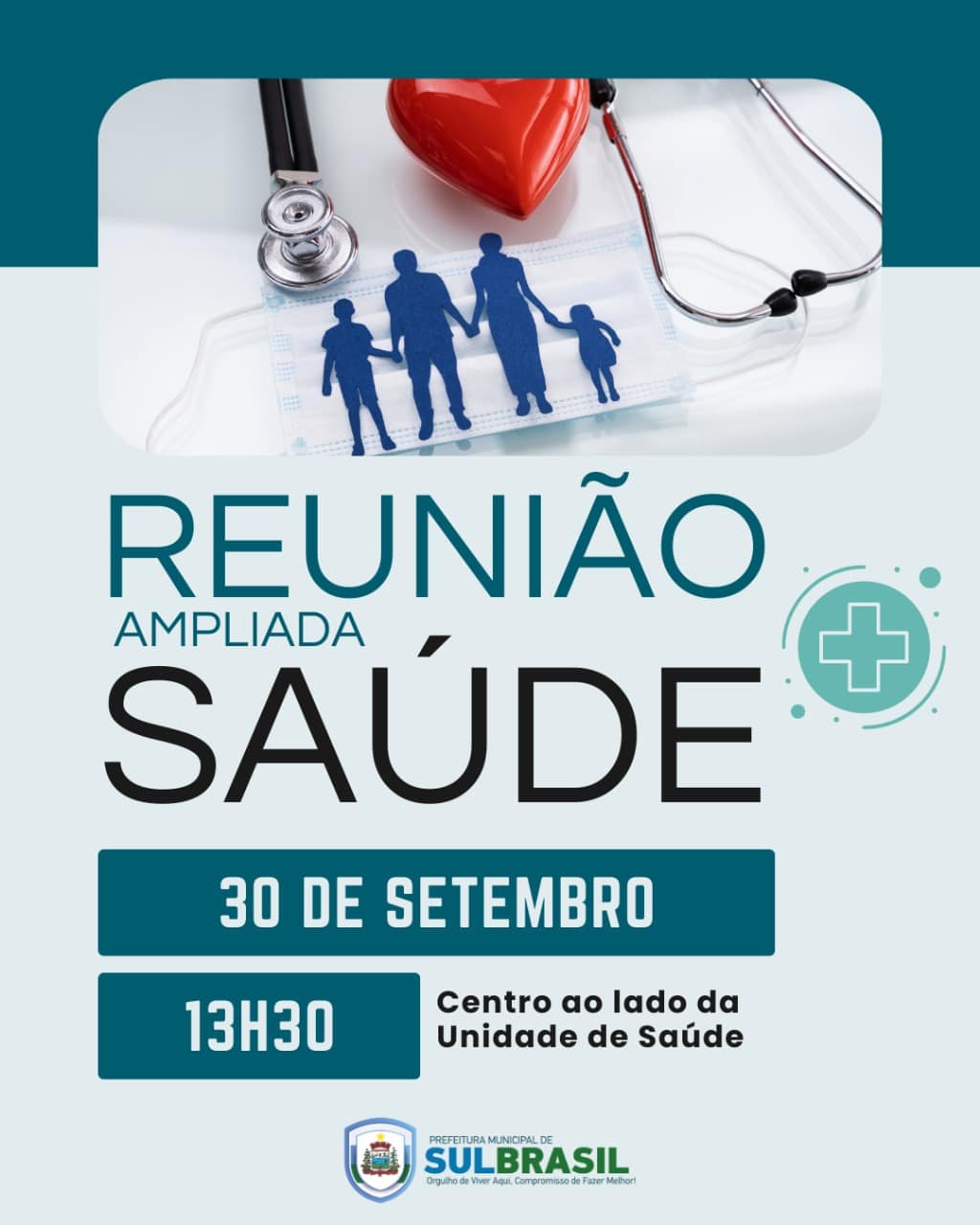 No dia 30 de setembro, a Secretaria de Saúde de Sul Brasil promoverá uma importante Reunião Ampliada de Saúde, que será realizada no Centro ao lado do Posto de Saúde, a partir das 13h30, com acesso aberto a toda a comunidade. Durante o encontro, serão debatidas propostas para a elaboração do novo Plano Municipal de Saúde e acontecerá também a eleição do novo Conselho Municipal de Saúde. Em função da atividade, a Unidade Básica de Saúde estará fechada durante o período da tarde.