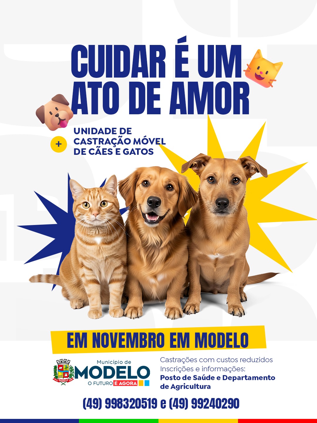 A castração de cães e gatos tem se consolidado como uma das principais políticas públicas de saúde e bem-estar animal em diversos municípios brasileiros, e em Modelo não é diferente. Por isso está chegando a Unidade Móvel de Castração de Cães e Gatos. O mutirão de castração será realizado em novembro no município.